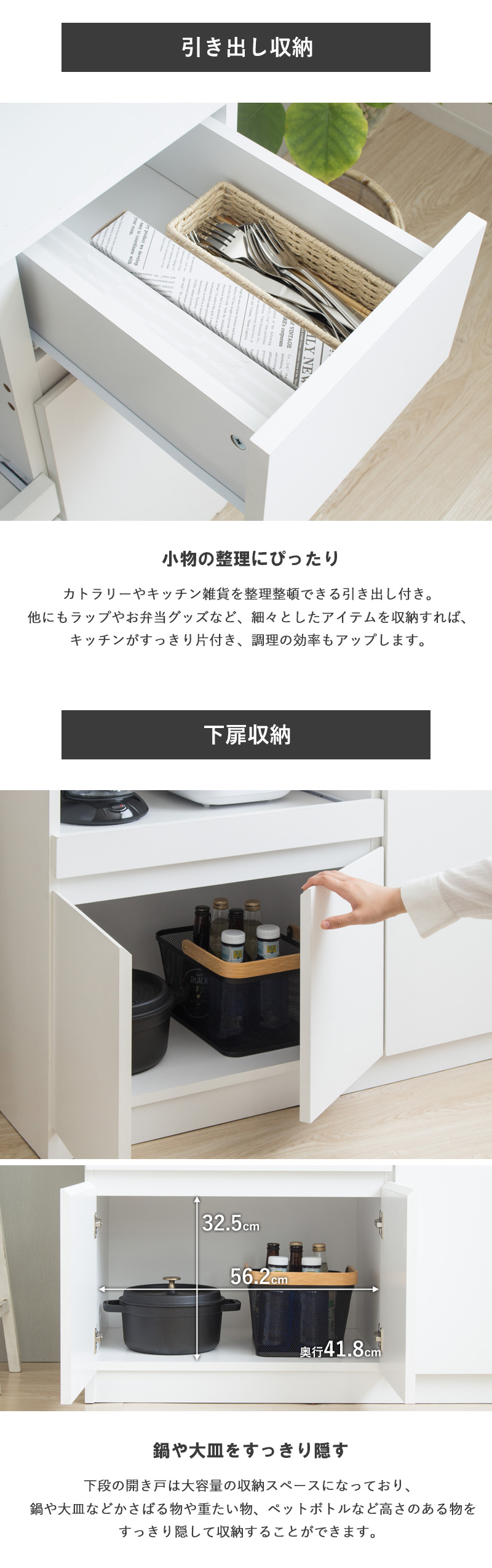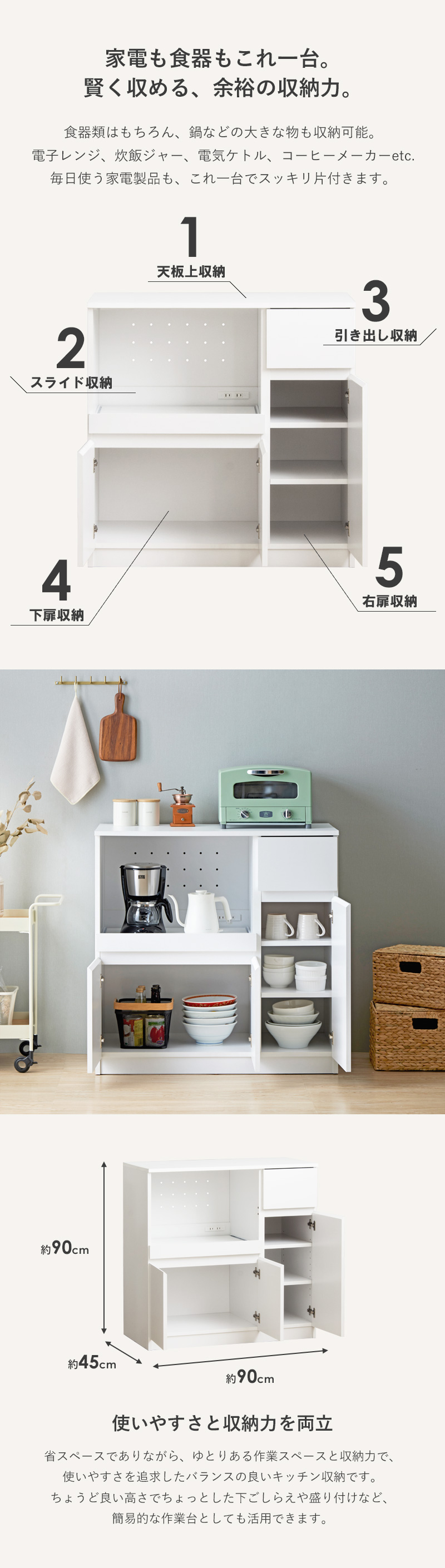 省スペースでも食器や家電をまとめて収納できるキッチンカウンターです。食器棚として食器や食材、調理器具などの収納はもちろん、レンジ台・家電ラックとして電子レンジやキッチン家電の収納がこれ一台で叶います。幅90cmのゆとりがある天板は調理の作業スペースとしても活用OK。メインの調理スペースが手狭な時、補助スペースとして下ごしらえや調理補助に使えて作業効率がアップします!
