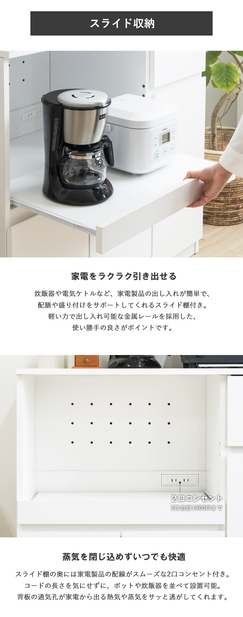 | 仕様 | 本体重量:約33kg 2口コンセント(1500W)付き 移動棚2枚 耐荷重(約):天板20kg、地板15kg、移動棚10kg、スライド棚5kg、引出5kg 付属品:ネジ穴隠しシール お客様組み立て品(組立目安時間:約60分) |