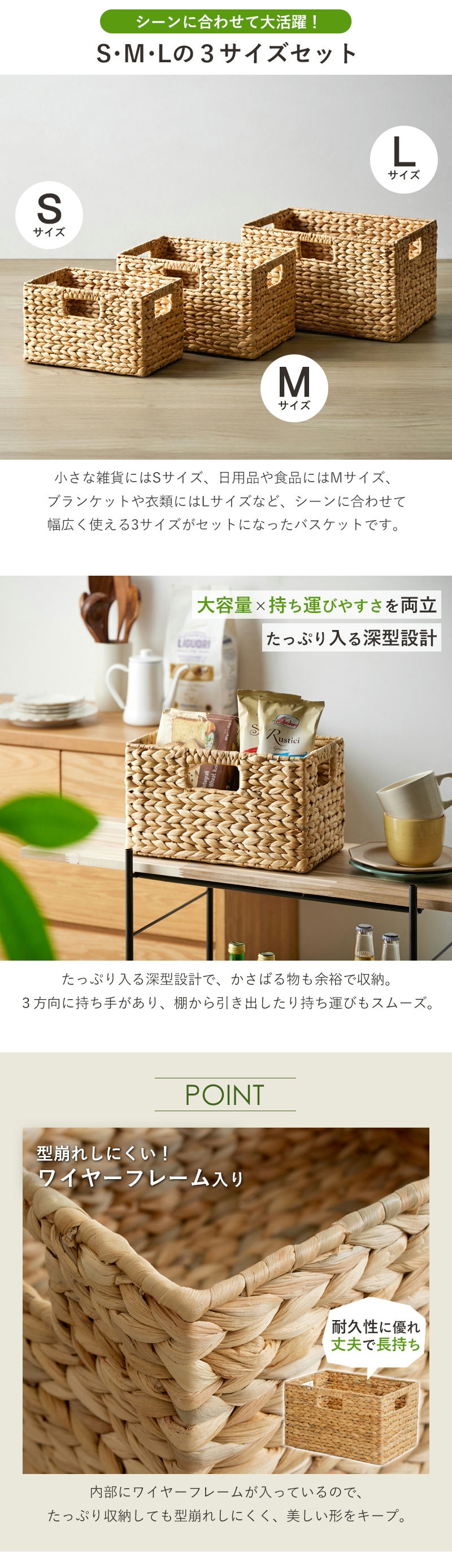 天然素材のウォーターヒヤシンスを、熟練の職人が手作業で丁寧に編み上げたバスケット。手仕事ならではの温かみとナチュラルな風合いが、毎日の暮らしにそっと寄り添います。S、M、Lの3サイズセットになっているので、家中どこでも様々な用途に活躍。ごちゃつきがちな小物をすっきり収納し、生活感を隠しながらお部屋を美しく整えます。使い込むほどに味わいが増す、自然の恵みと職人のぬくもりが詰まったこのバスケットが、あなたのお部屋をより居心地の良い空間へと変えてくれることでしょう。