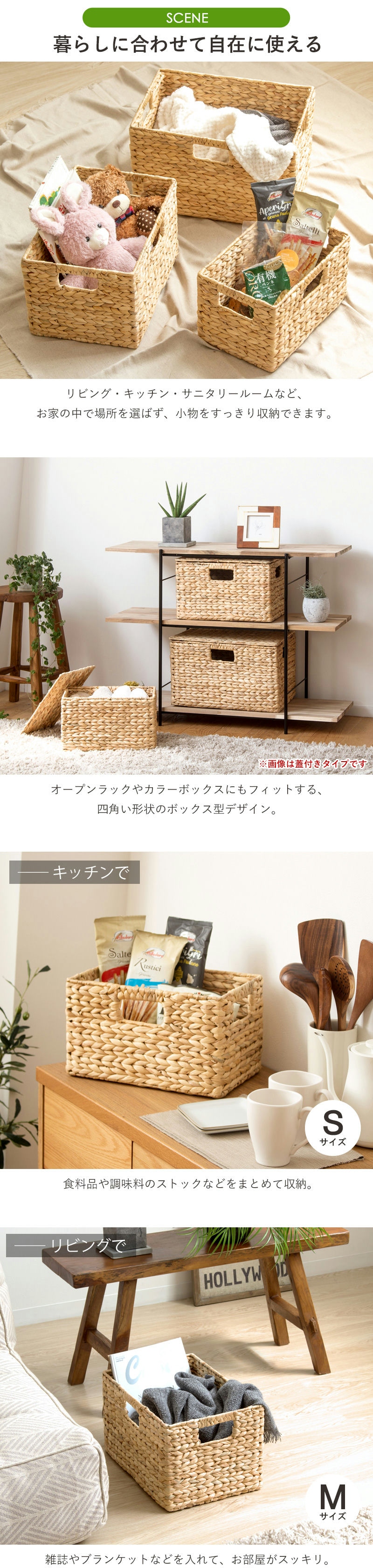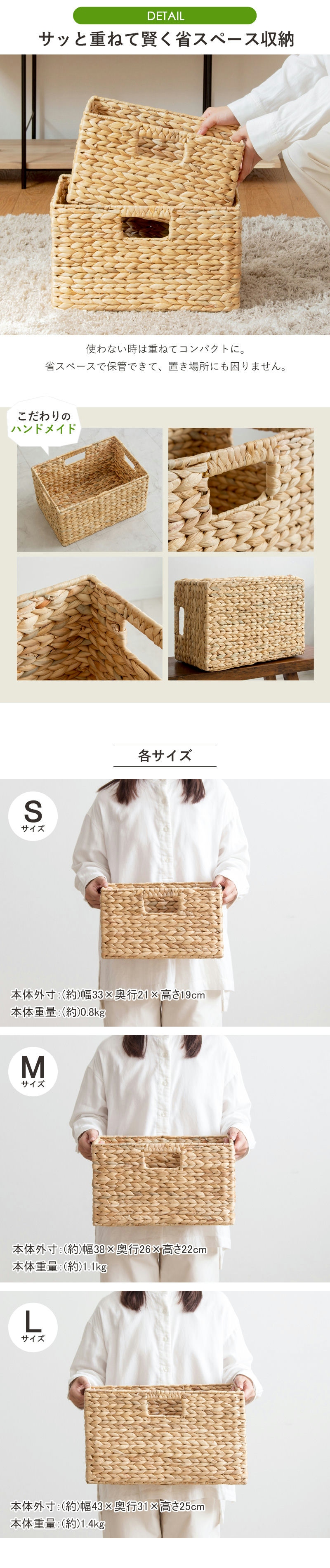 | 仕様 | Sサイズ:約0.8kg Mサイズ:約1.1kg Lサイズ:約1.4kg ※こちらの商品は「ふた無し」タイプです 素材特性について: 自然な風合いを活かしているため、色味に濃淡の差や、ささくれ・編み止めが目立つ場合があります。 ハンドメイド製品について: 手作りのためサイズは概寸で、若干の歪みや個体差が生じることがあります。 |