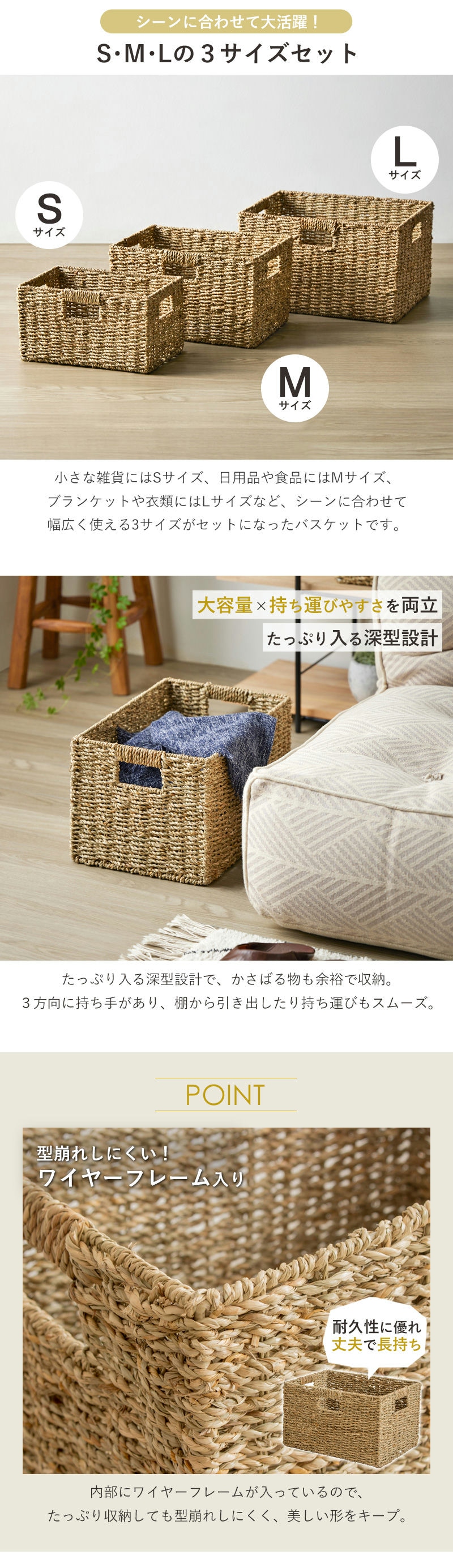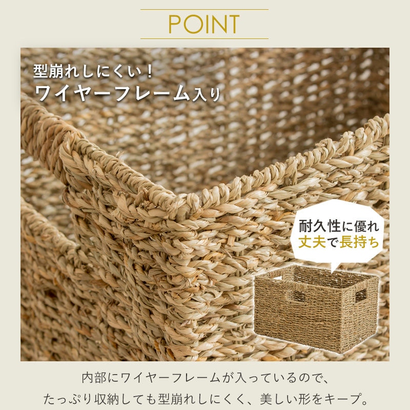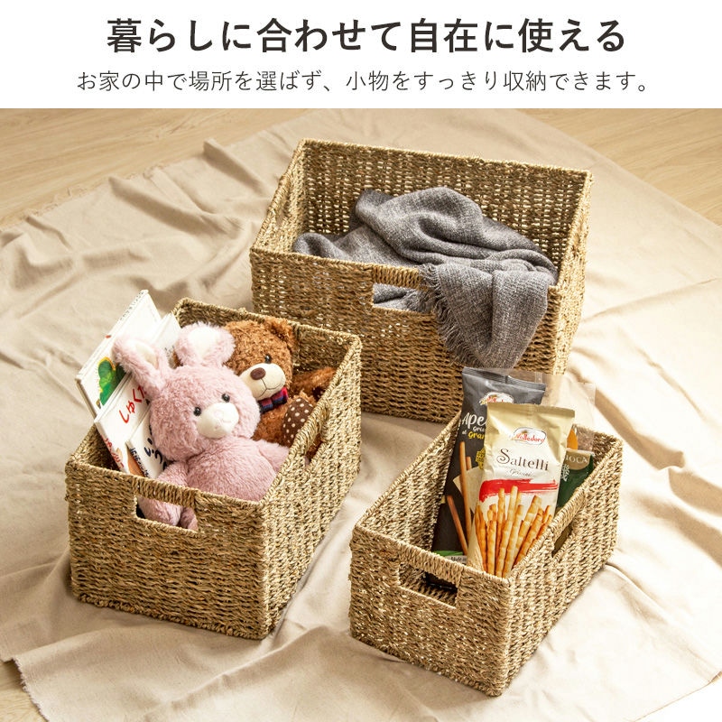 天然素材のシーグラスを、熟練の職人が手作業で丁寧に編み上げたバスケット。手仕事ならではの温かみとナチュラルな風合いが、毎日の暮らしにそっと寄り添います。S、M、Lの3サイズセットになっているので、家中どこでも様々な用途に活躍。ごちゃつきがちな小物をすっきり収納し、生活感を隠しながらお部屋を美しく整えます。使い込むほどに味わいが増す、自然の恵みと職人のぬくもりが詰まったこのバスケットが、あなたのお部屋をより居心地の良い空間へと変えてくれることでしょう。