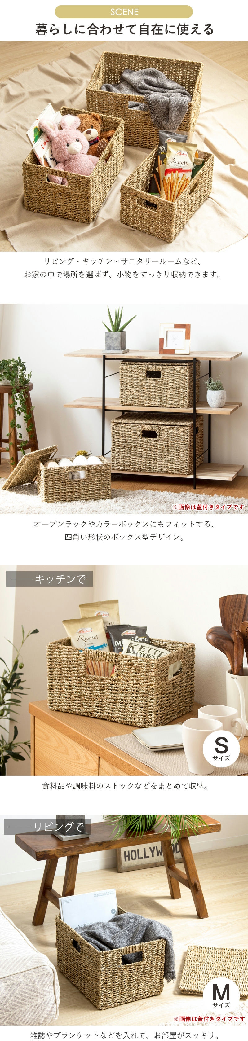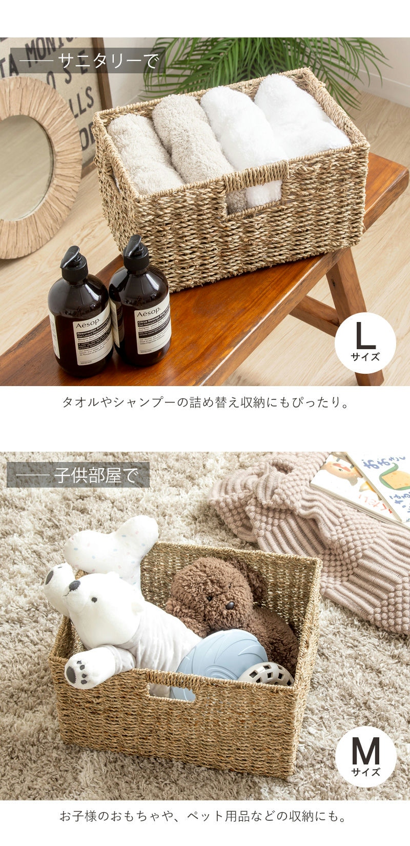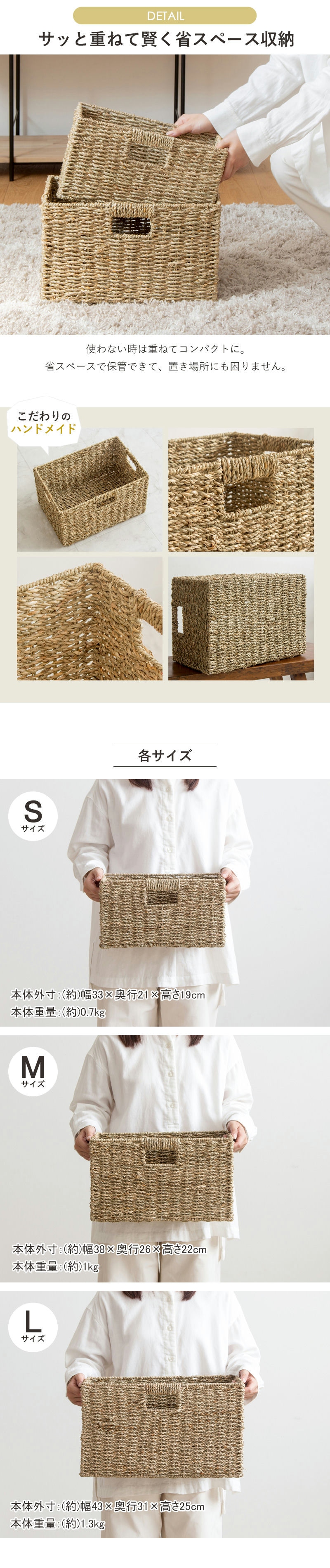 | 仕様 | Sサイズ:約0.7kg Mサイズ:約1kg Lサイズ:約1.3kg ※こちらの商品は「ふた無し」タイプです 素材特性について: 自然な風合いを活かしているため、色味に濃淡の差や、ささくれ・編み止めが目立つ場合があります。 ハンドメイド製品について: 手作りのためサイズは概寸で、若干の歪みや個体差が生じることがあります。 |
