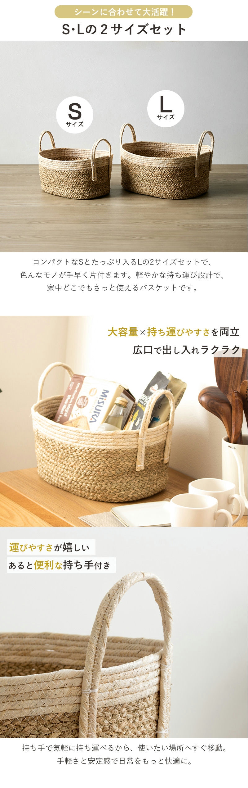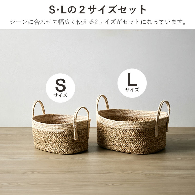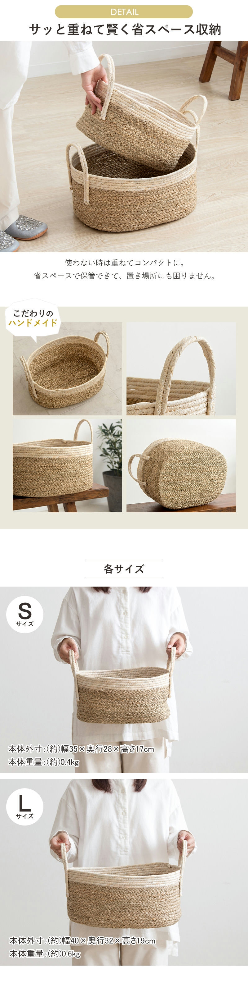 天然素材のシーグラスを、熟練の職人が手作業で丁寧に編み上げたバスケット。手仕事ならではの温かみとナチュラルな風合いが、毎日の暮らしにそっと寄り添います。S、Lの2サイズセットになっているので、家中どこでも様々な用途に活躍。ごちゃつきがちな小物をすっきり収納し、生活感を隠しながらお部屋を美しく整えます。使い込むほどに味わいが増す、自然の恵みと職人のぬくもりが詰まったこのバスケットが、あなたのお部屋をより居心地の良い空間へと変えてくれることでしょう。