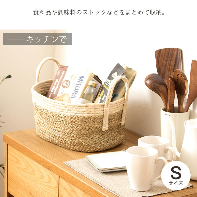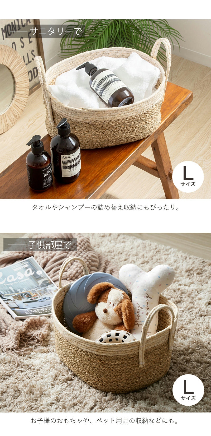 | 仕様 | 商品重量 Sサイズ:約0.4kg Lサイズ:約0.6kg 持ち手付き 素材特性について: 自然な風合いを活かしているため、色味に濃淡の差や、ささくれ・編み止めが目立つ場合があります。 ハンドメイド製品について: 手作りのためサイズは概寸で、若干の歪みや個体差が生じることがあります。 |