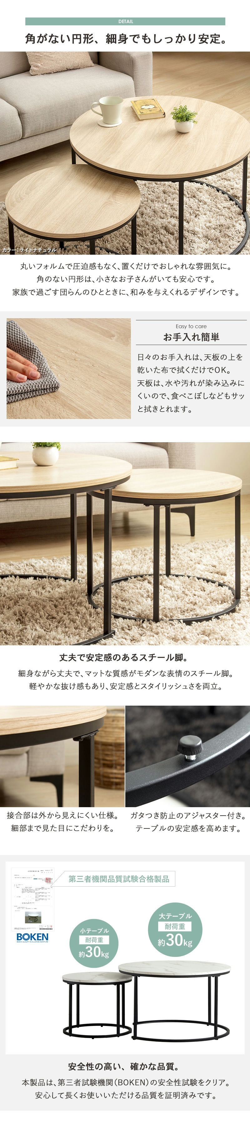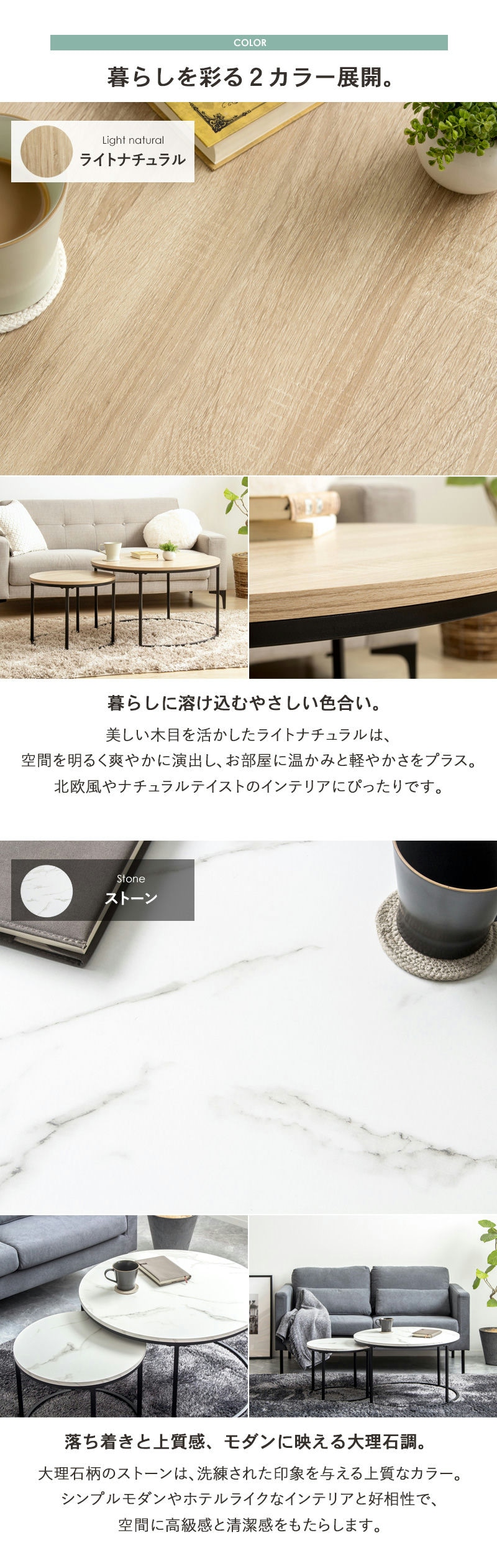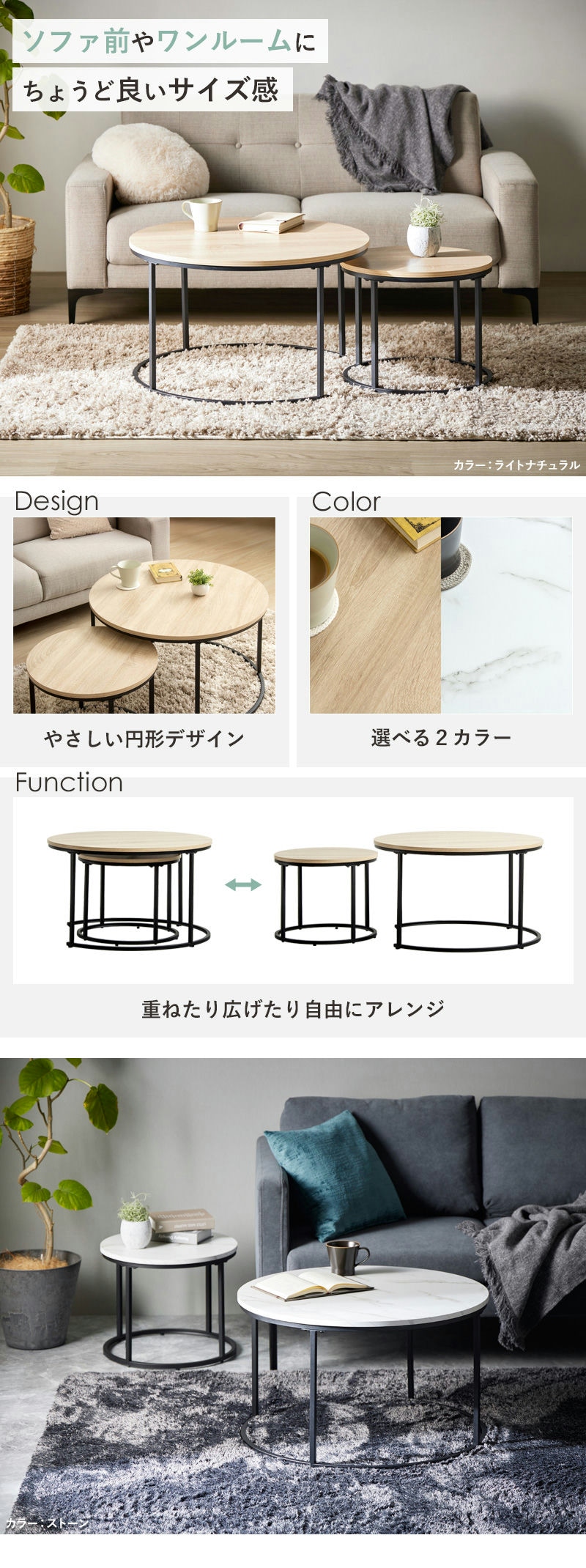 丸みのあるやさしいデザインと、使い勝手の良い2サイズを組み合わせたネストテーブル。大きすぎず小さすぎない、使いやすいバランスの72cmと45cmの組み合わせは、ソファ前やワンルームにぴったりのサイズ感です。普段は重ねてコンパクトに、来客時や作業時は並べて広々と使ったりと、自由にレイアウトできる便利さも、このテーブルの大きな魅力と言えます。ライトナチュラルとストーンの2カラーで、お部屋の雰囲気に合わせてコーディネート。見た目も実用性も兼ね備えた、暮らしに寄り添うネストテーブルです。