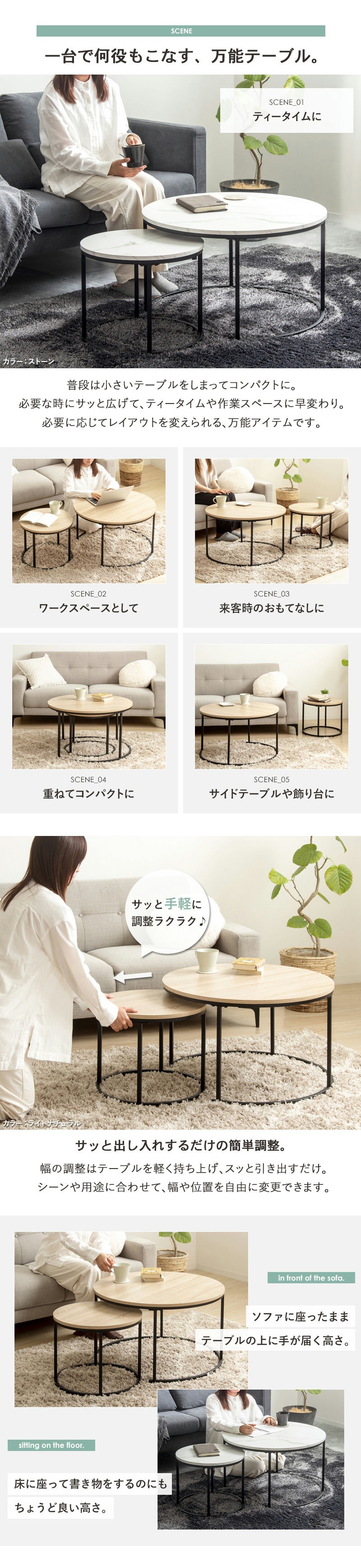 コンパクトにも、ワイドにも思いのまま。レイアウト自在な円形ネストテーブル。