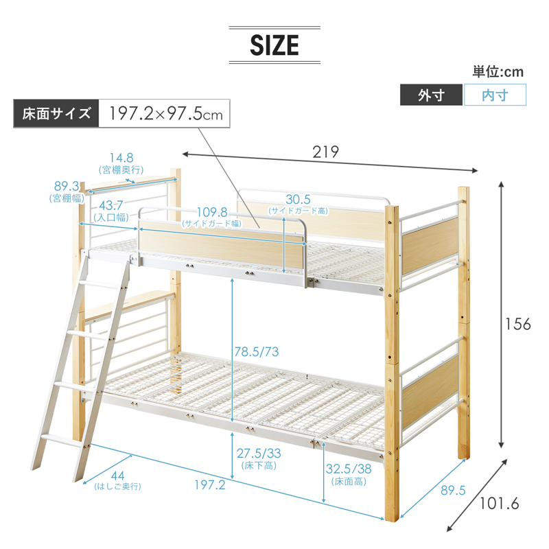 | サイズ | [2段ベッド使用時] 本体:幅101.6×奥行219×高さ156cm 床面サイズ:97.5×197.2cm 床面高さ:32.5(27.5)/38(32.5)cm ※高さ2段階調節可/()内は床下有効内寸 [キングベッド使用時] 本体:幅201×奥行219×高さ78cm 床面サイズ:194.5×197.2cm [シングルベッド使用時] 本体:幅101.6×奥行219×高さ78cm |