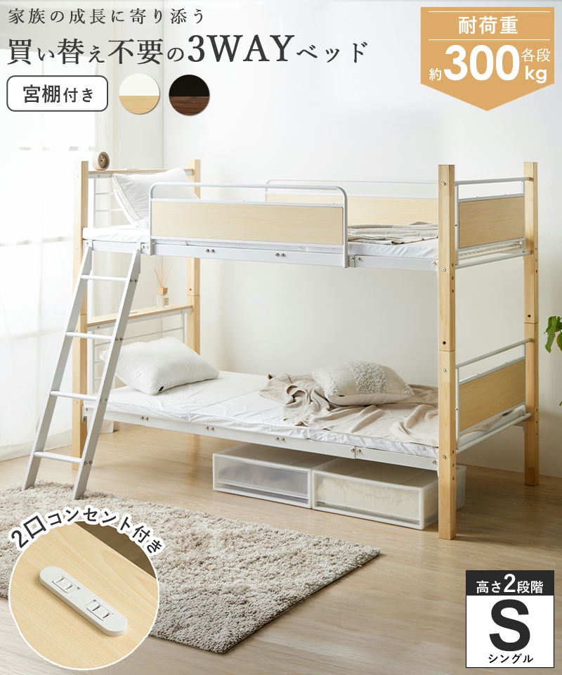 ライフスタイルに合わせて「2段ベッド」「シングル」「キングサイズ」と自由に変化する3WAY仕様。家族の成長に寄り添いながら、長く使える一台です。