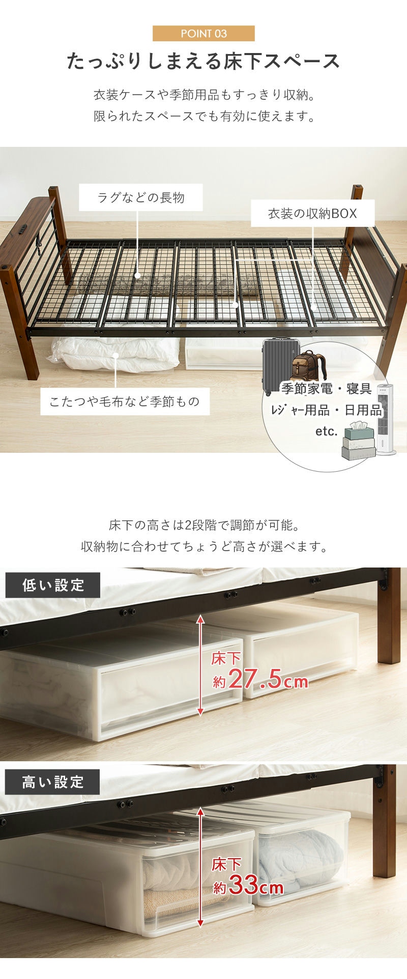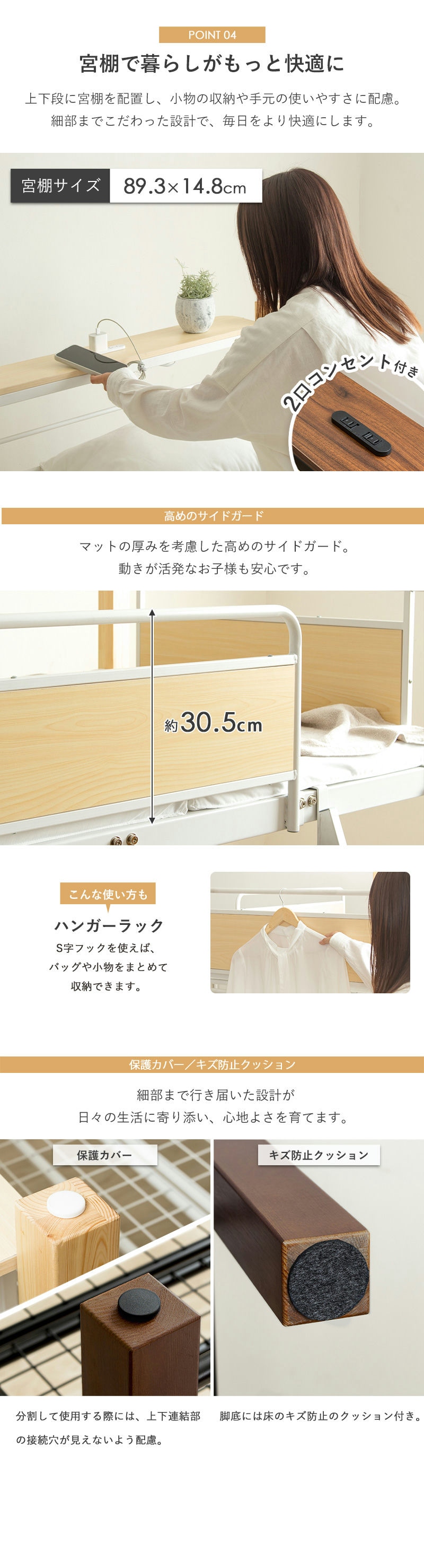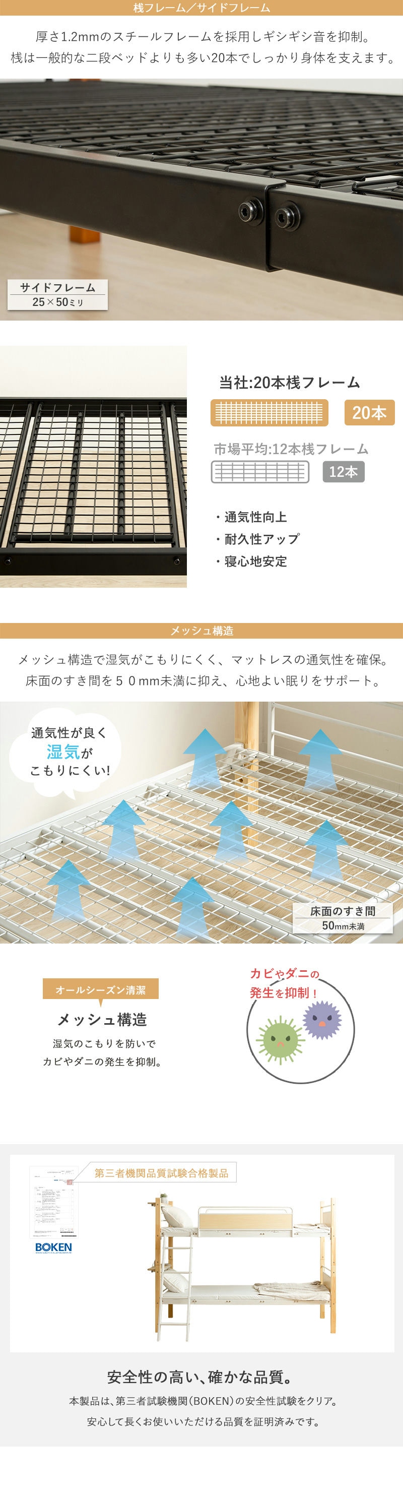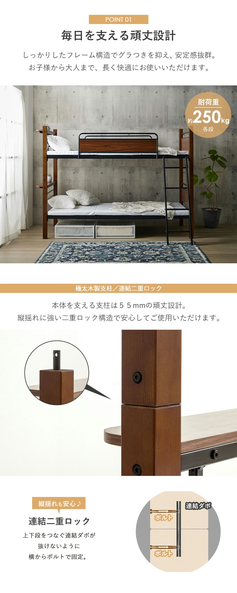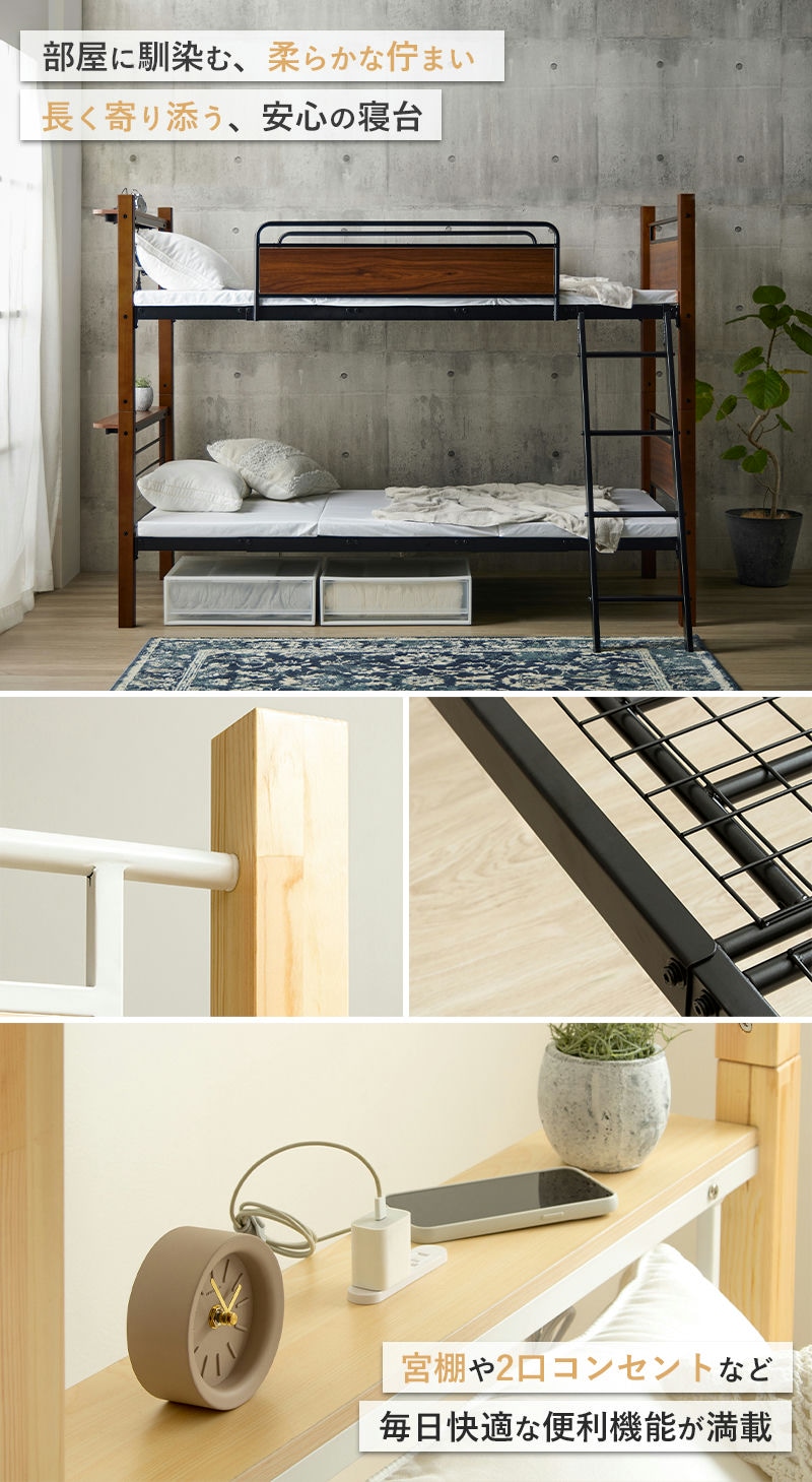 しっかりとしたスチール構造と天然木のぬくもりが融合し、温かみのあるデザインと抜群の安定感を両立。耐荷重は安心の250kgで、お子様から大人まで快適に眠れます。